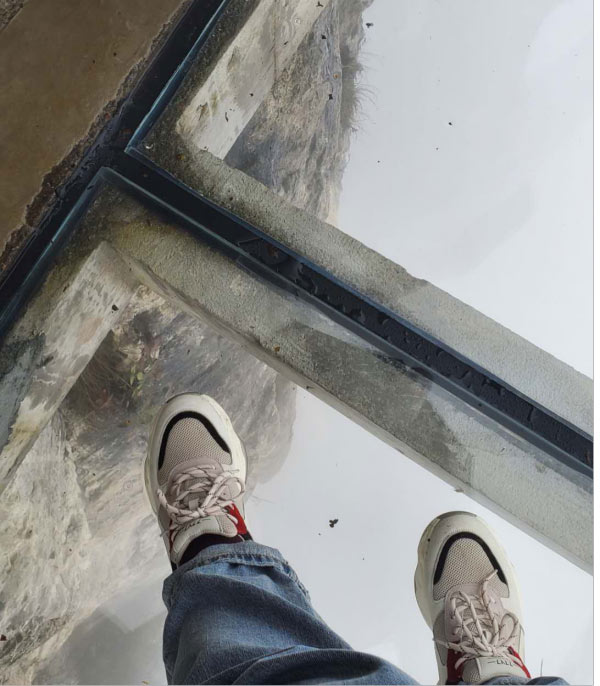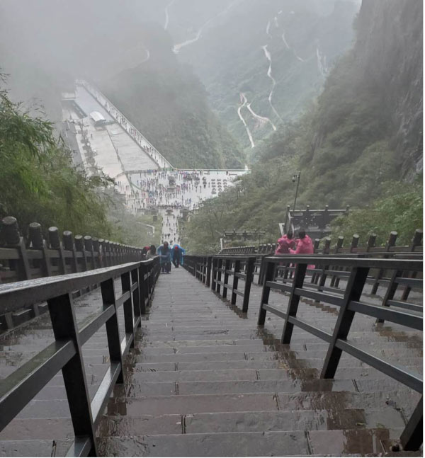 于是在我們又轉(zhuǎn)了7層電梯后,終于來到了天門洞上。依然是白茫茫的一片,天門山棧道,底下原本高聳陡峭的山崖,在白霧的襯托下,一點兒也不讓人覺得害怕了,只是雨天濕滑,內(nèi)心在默默祈禱千萬不要摔倒就好。